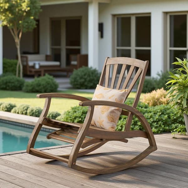 Gray Wood Outdoor Rocking Chair, Patio Rocker with Retractable Footrest Panel