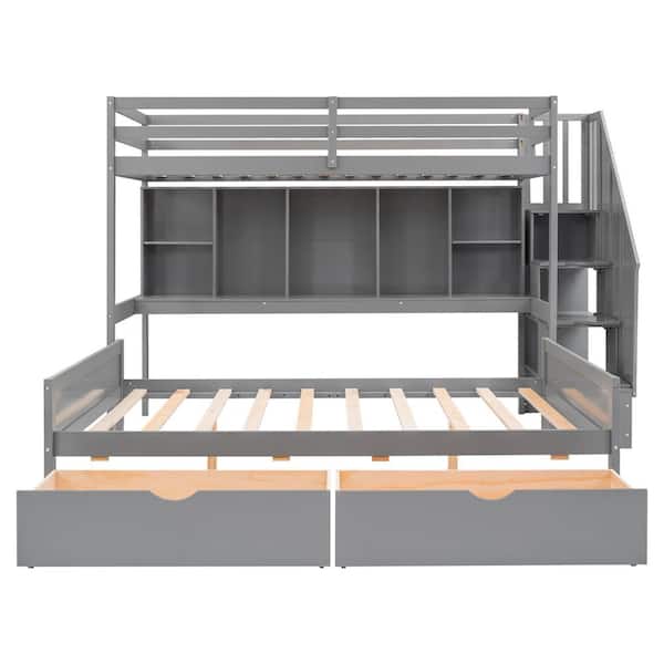 Gray Wood Twin XL Over Full Bunk Bed with Built-in Storage Shelves, Drawers And Staircase