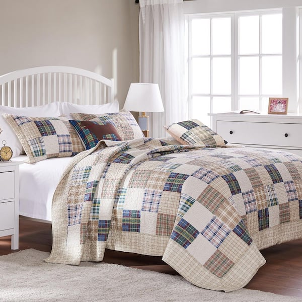 Oxford Plaid Taupe 3-Piece Cotton Blend Queen Jumbo Quilt Set