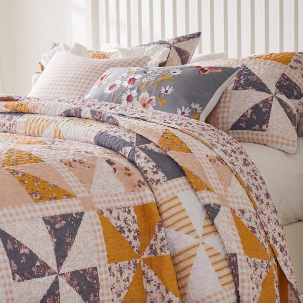 Pinwheel and Posey Cottage 3-Piece Peach Cotton Blend King/Cal King Quilt Set