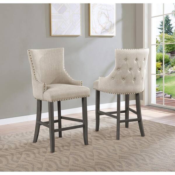 Greg 45 in. Beige Linen Fabric High Back Wood Bar Stool Tufted Buttons And Nail Head Trim (Set of 2)