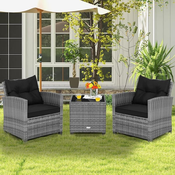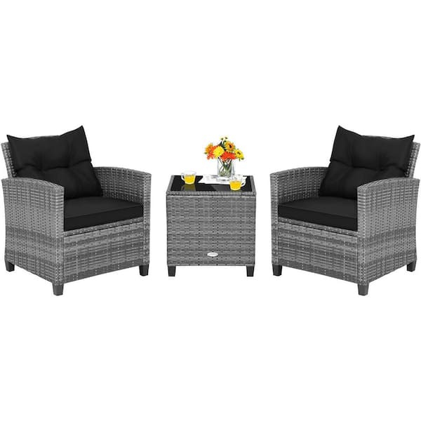 Grey 3-Piece Wicker Patio Conversation Set with Black Cushions