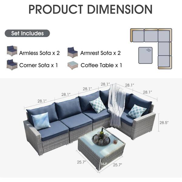 Grey 6-Piece Wicker Outdoor Sectional Sofas Set Patio Conversation Set with Blue Cushions for Poolside, Backyard, Garden