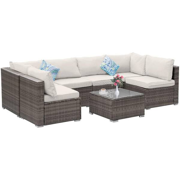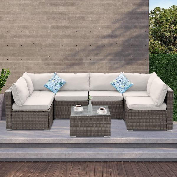 Grey 7-Piece PE Rattan Wicker Outdoor Patio Conversation Sofa Chair Sectional Set with Glass Table and Beige Cushions