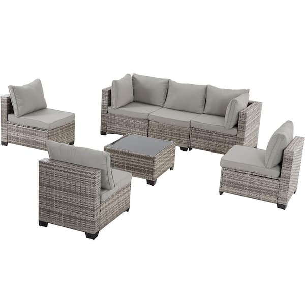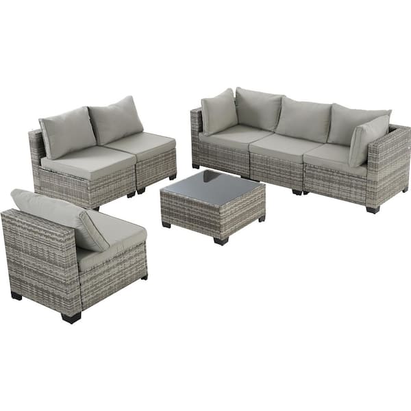 Grey 7-Piece PE Wicker Outdoor Patio Furniture Sectional Sofa Set With End Table And Grey Cushions