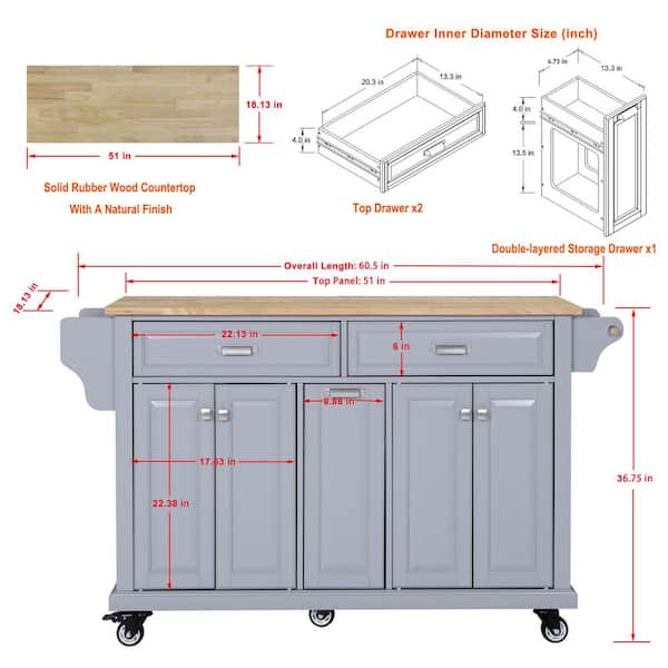 Grey Rubber wood Kitchen Cart with Towel Rack and Spice Rack