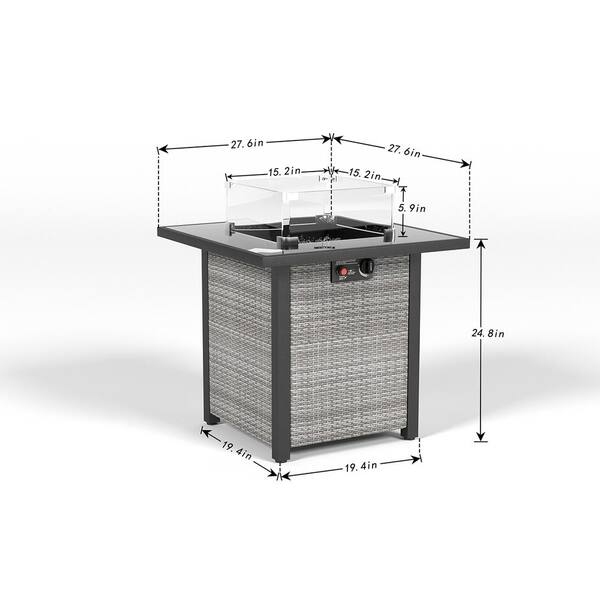 Grey White 28 in. Outdoor Wicker Propane Fire Pit Table, 50000 BTU Gas Firepits Tempered Glass Tabletop Glass Wind Guard