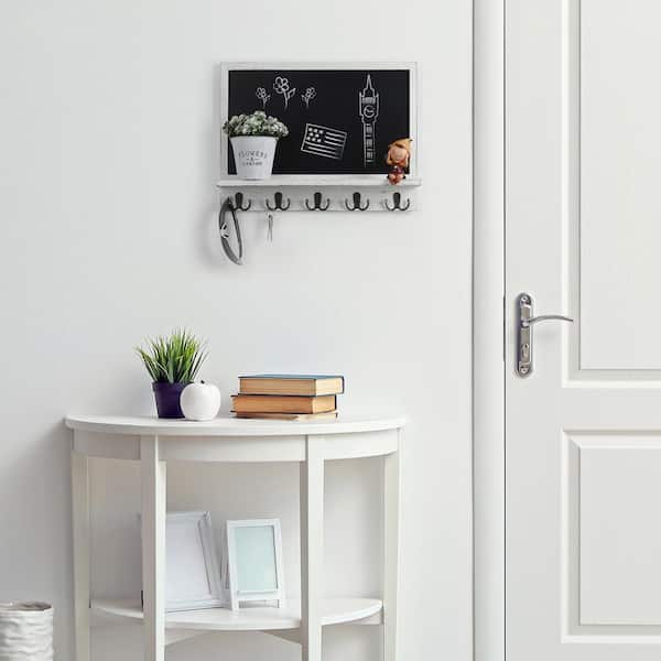 Grey White Wood Wall Mounted Entryway Chalkboard Sign with Display Shelf and 5-Dual Metal Key Hooks