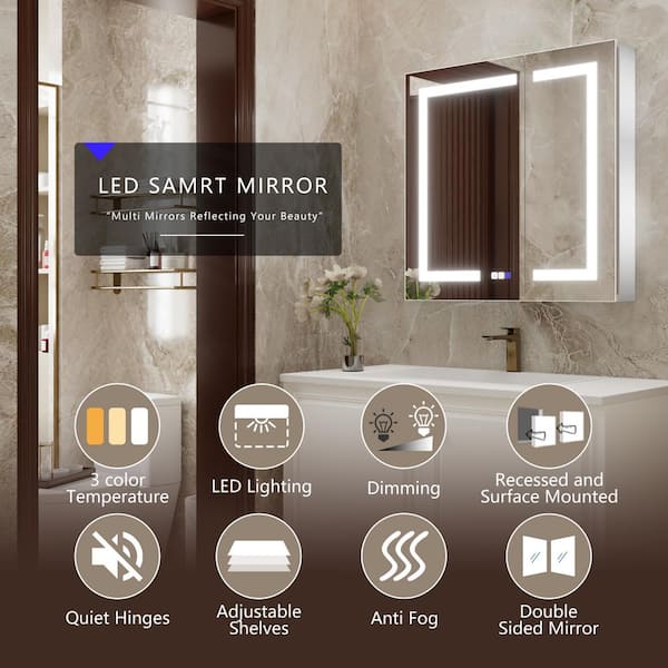 30 in. W x 30 in. H Rectangular Silver Aluminum Recessed/Surface Mount Medicine Cabinet with Mirror and LED