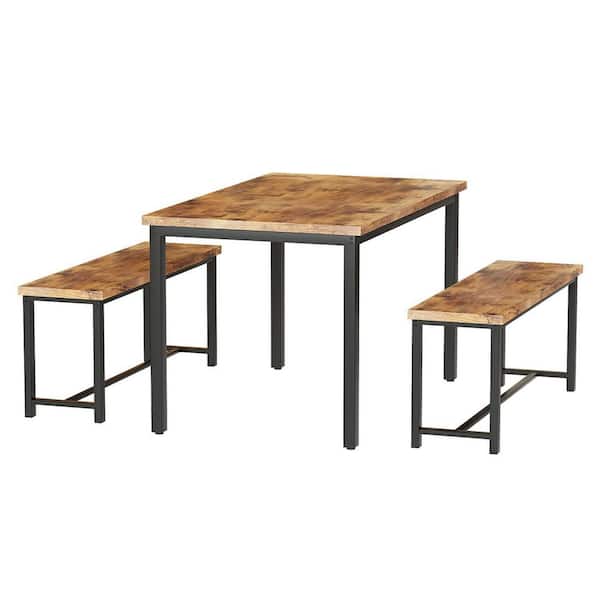 Grondin Industrial Style 3-Piece Rectangle Brown MDF Top Bar Table Set Seats 4, Kitchen Dining Room Set with 2 Benches