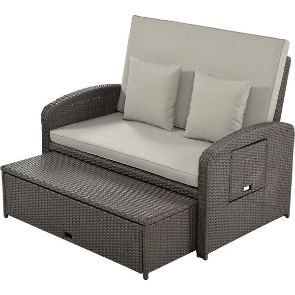 2-Person PE Rattan Double Lounge Chair, Outdoor Daybed Recliner with Cushions, Adjustable Back, Gray Cover Included