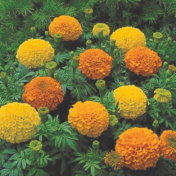 • Huge double marigold blooms in vibrant golds, oranges and yellows