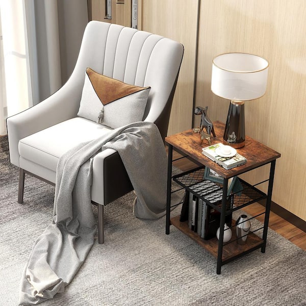 15.in. W 3-Tier Side Table Industrial Rectangle End Table w/Adjustable Height Metal Mesh Shelf Brown
