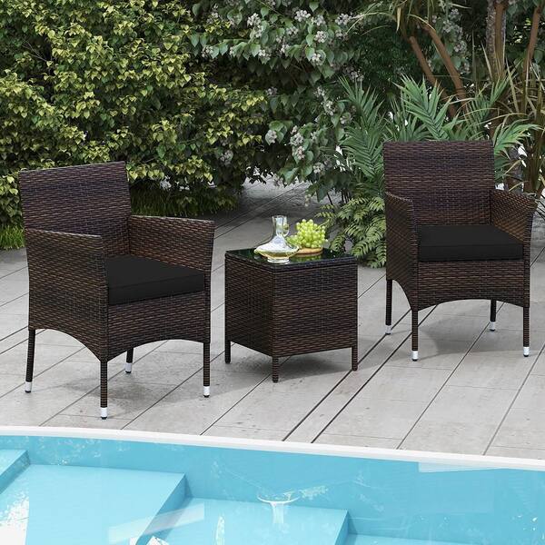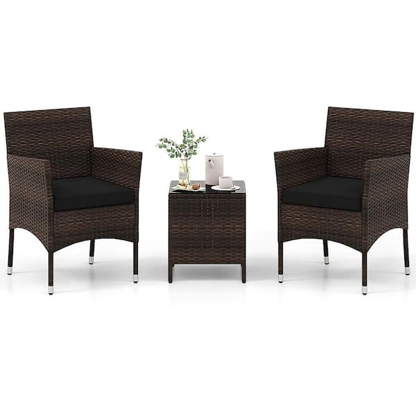3 PCS Outdoor Conversation Set w/ Cushioned Seat & Tempered Glass Tabletop Black
