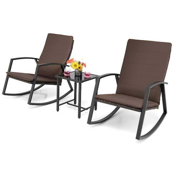 3-Piece Rattan Bistro Rocking Chair Set Patio Furniture Set w/Brown Cushions