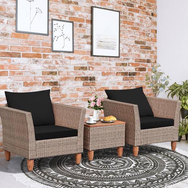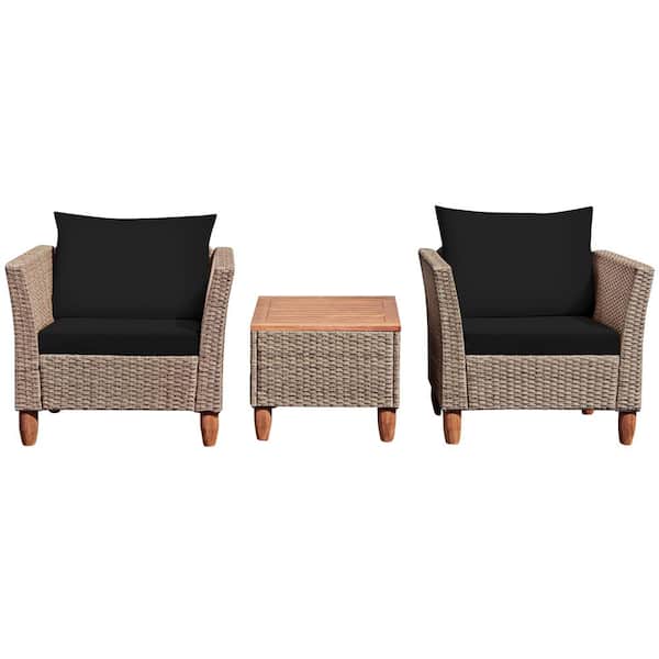 3-Piece Rattan Patio Conversation Furniture Set with Wooden Feet Black Cushions