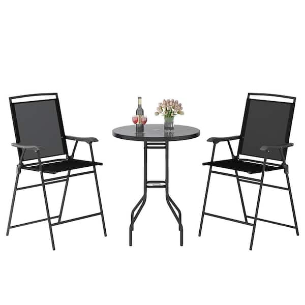 3-Piece Swivel Metal Patio Conversation Set Outdoor Bar Stool Set with DPC Tabletop Umbrella Hole and Footrest 2 Chairs