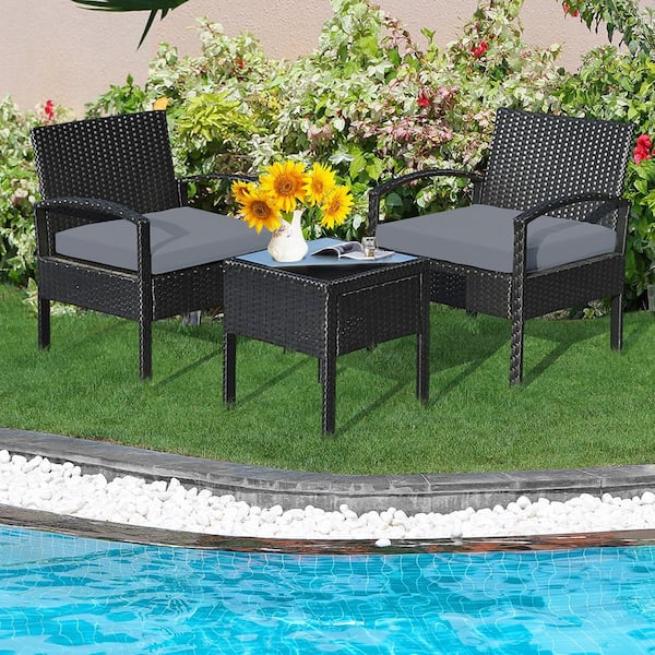 3-Pieces Patio Rattan Conversation Furniture Set Outdoor Yard with Grey Cushions