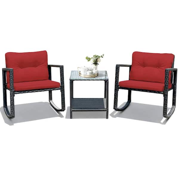 3-Pieces Rattan Patio Rocking Chair Table Furniture Set with Burgundy Cushions