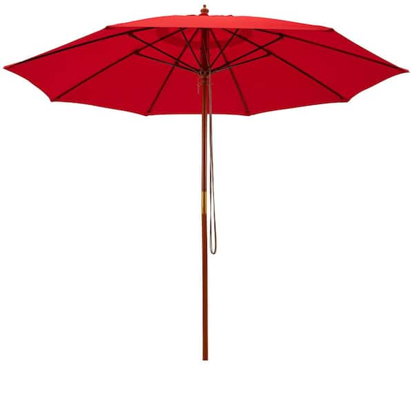 9.5 ft. Rope Pulley Wooden Market Umbrella with Fiberglass Ribs Patio in Red