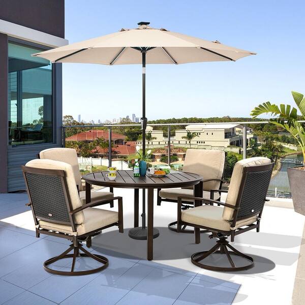 Brown Metal Outdoor Patio Dining Chair Swivel Chairs 360-Degree Rotating Set with Beige Cushions (4-Pack)