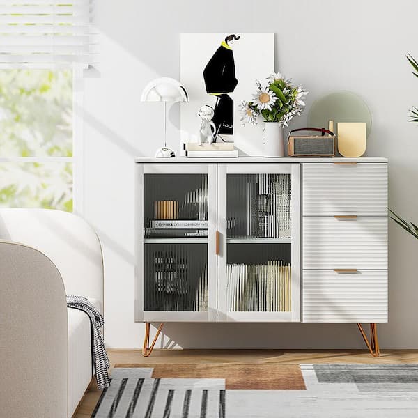 White Wood Top 42.5 in. Buffet Server Sideboard with 2-Tempered Glass Doors and 3-Drawers for Kitchen