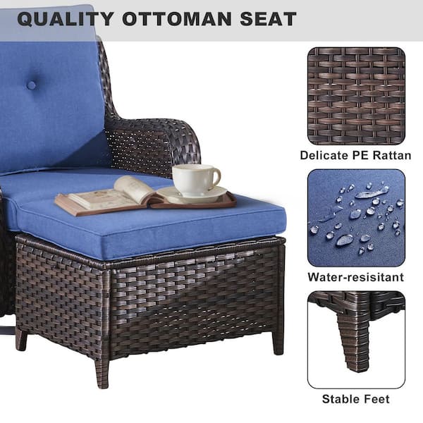 Carlos 6-Piece All-Weather Brown Wicker Patio Conversation Set with Armchairs, CushionGuard Blue Cushions and Ottomans