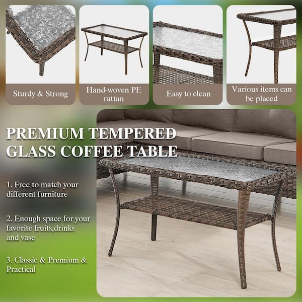Carlos 8-Piece Brown Wicker Patio Conversation Set with Gray Cushions Swivel Chairs, Patio Chairs and Coffee Table