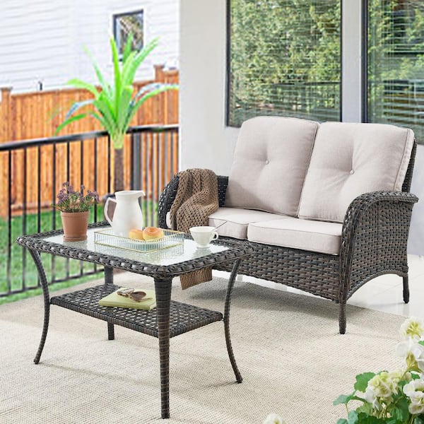 Carlos Brown 2-Piece Wicker Conversation Set with Beige Cushions