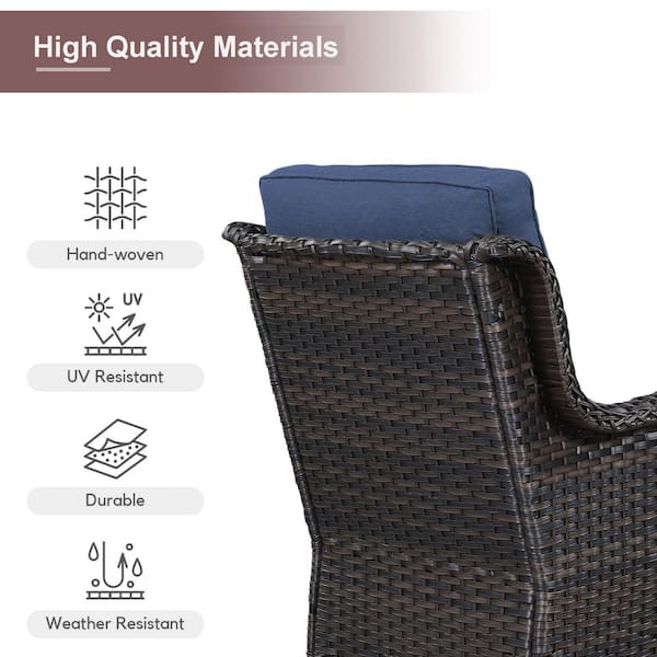 Carolina 2-Person High Back Brown Wicker Outdoor Rocking Chair Set Patio Swivel Chair Set with Blue Cushions