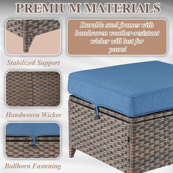 Kelsey 6-Piece Wicker Patio Conversation Seating Sofa Set with Ottomans and Blue Cushions