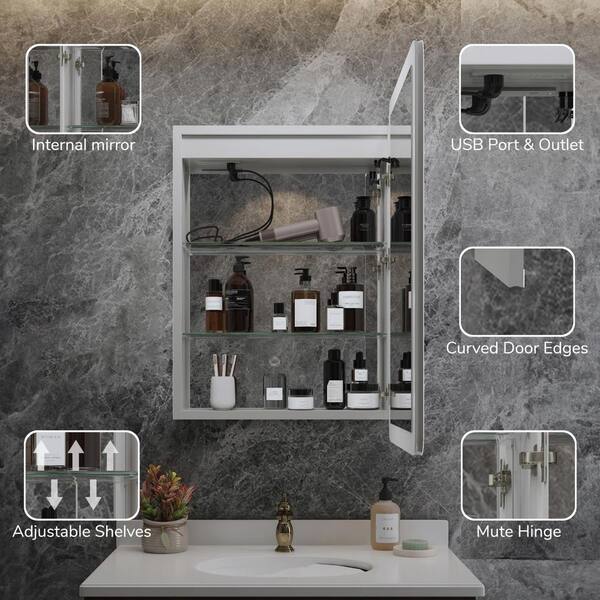 Artemis 20 in. W x 28 in. H Small Rectangular Aluminum Rounded Edge Dimmable Medicine Cabinet with Mirror, Right Hinge