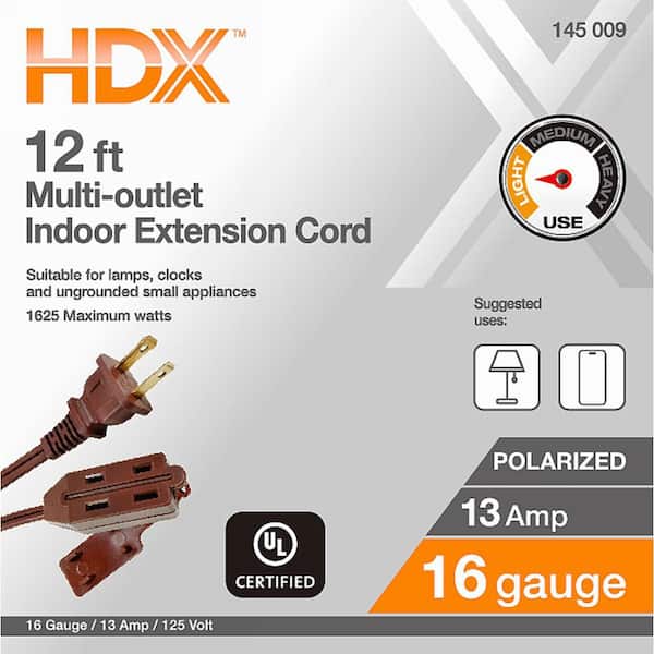 12 ft. 16/2 Light Duty Indoor Multi-Outlet Extension Cord, Brown