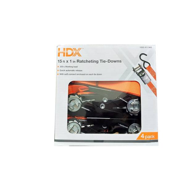 • Set includes (4) 1 in. x 15 ft. ratcheting tie-downs