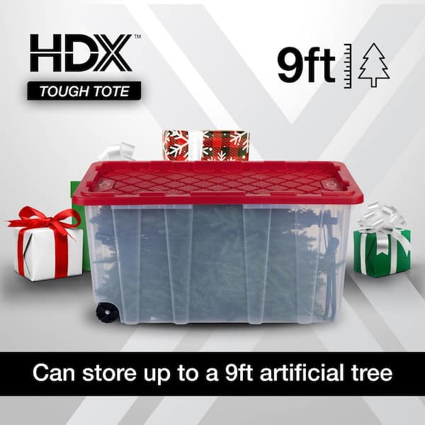 77 Gal. Tough Storage Tote with Wheels in Clear with Red Lid