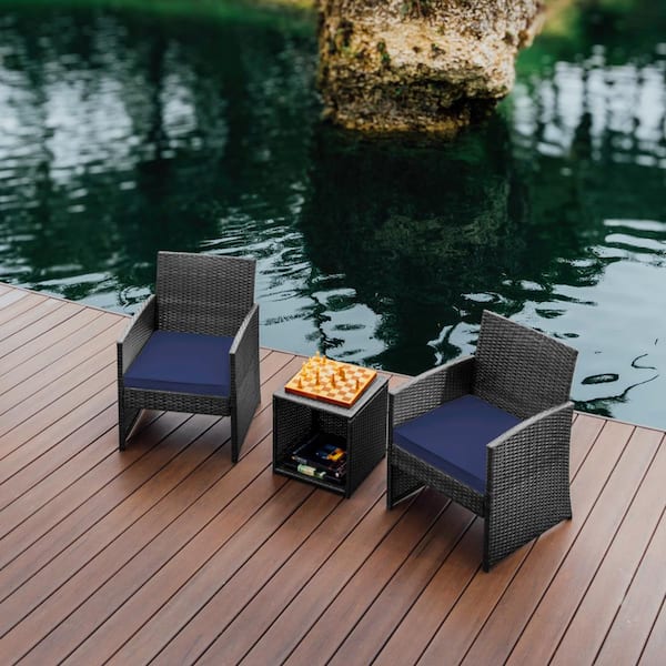 3-Piece Gray Patio Outdoor Furniture Wicker Conversation Set with Navy Cushions