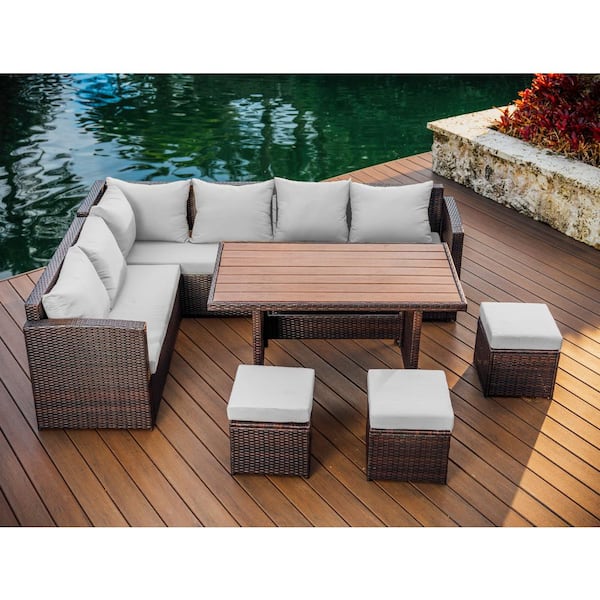 7-Piece Brown Wicker Patio Outdoor Dining Sofa Set, Sectional, Dining Table with Off-White Cushions