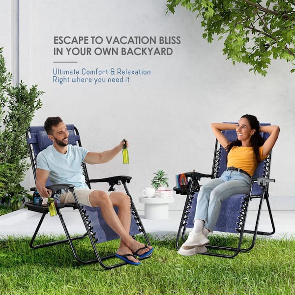 Blue Zero Gravity Chairs, Metal Outdoor Lawn Chair with Pillow & Cup Holder Tray