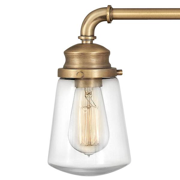 • Warm, textured Heritage Brass finish with clear glass shades