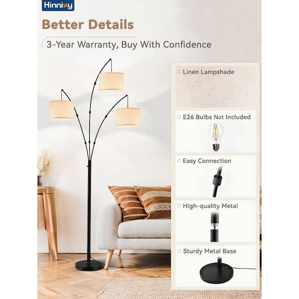 82 in. Matte Black Mid-Century Modern 3-light Dimmable Arc Floor Lamp for Living Room with Linen Beige Shades