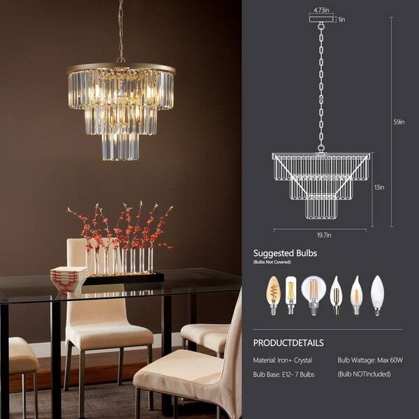 19.7 in. W 3-Tier 7-Light Gold Crystal Chandelier for Living Room and Kitchen Island with No Bulbs Included