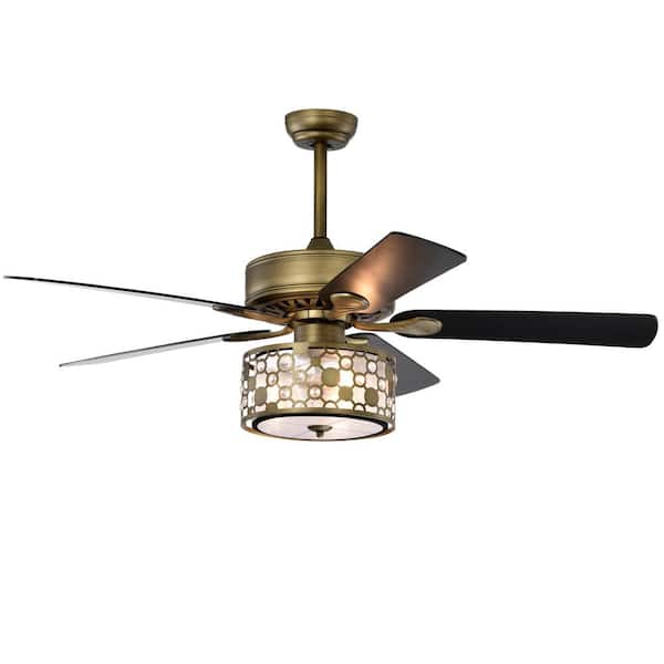 52 in. Indoor Antique Brass Ceiling Fan with Crystal Lampshade, 2-Color-Option Blades and Remote Included