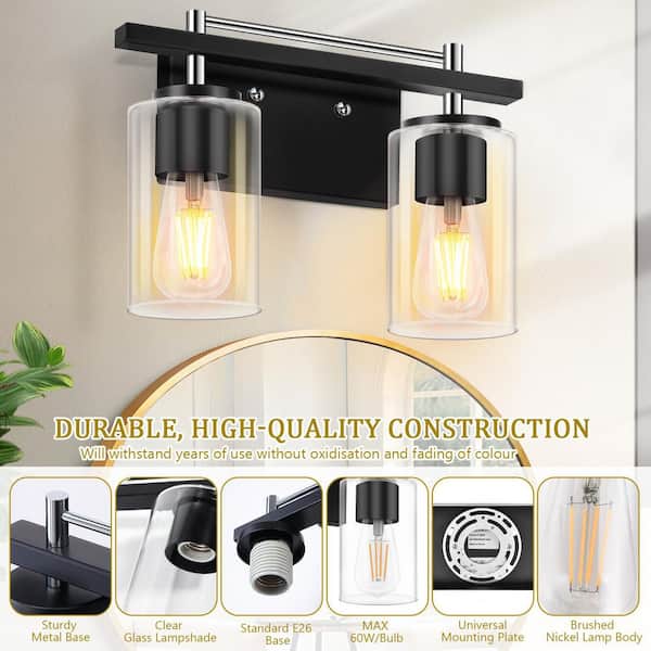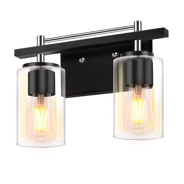 Farmhouse 10.6 in. 2-Light Chrome and Black Bathroom Vanity Light with Glass Shade