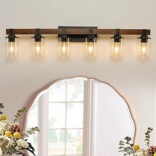 Farmhouse 42.3 in. 6-Light Walnut and Black Bathroom Vanity Light with Glass Shade