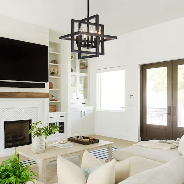 6-Light Black Industrial Geometric Chandelier Adjustable Height Rectangle Pendant Light for Dining Room