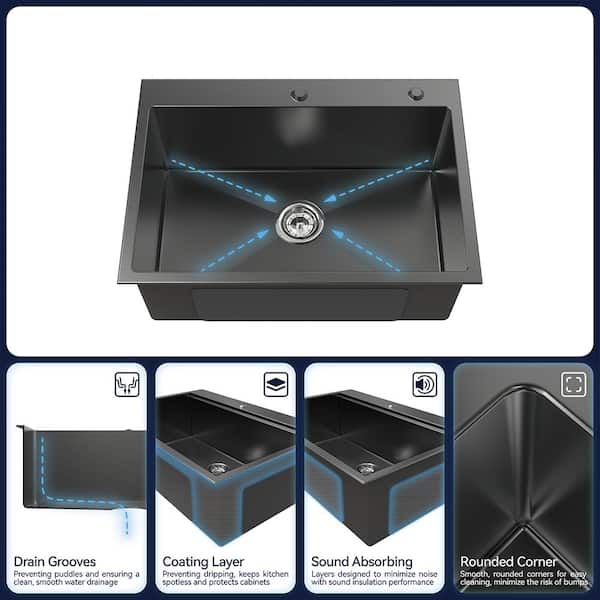 27 in Drop-In Single Bowl 20-Gauge Black Stainless Steel Workstation Kitchen Sink with US Standard Drain and Hook