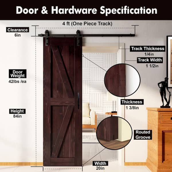 20 in. x 84 in. K-Frame Red Mahogany Solid Pine Wood Interior Sliding Barn Door with Hardware Kit, Non-Bypass