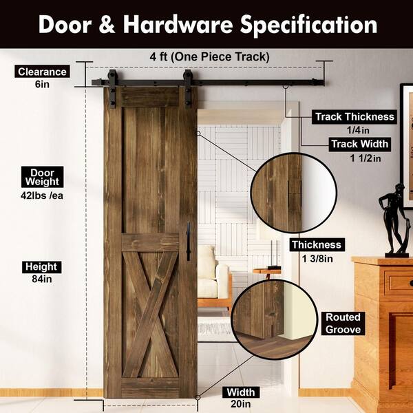 20 in. x 84 in. X-Frame Walnut Solid Pine Wood Interior Sliding Barn Door with Hardware Kit, Non-Bypass