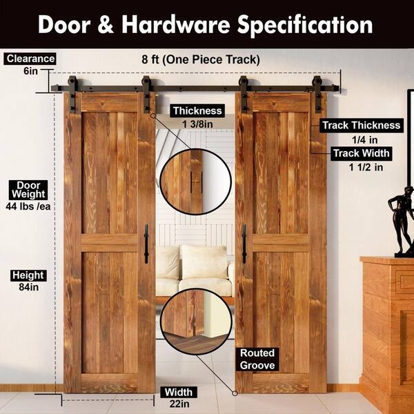 22 in. x 84 in. H-Frame Early American Double Pine Wood Interior Sliding Barn Door with Hardware Kit Non-Bypass
