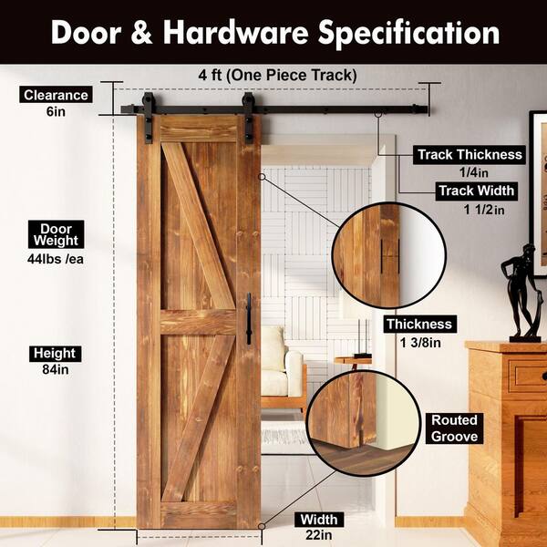 22 in. x 84 in. K-Frame Early American Solid Pine Wood Interior Sliding Barn Door with Hardware Kit, Non-Bypass